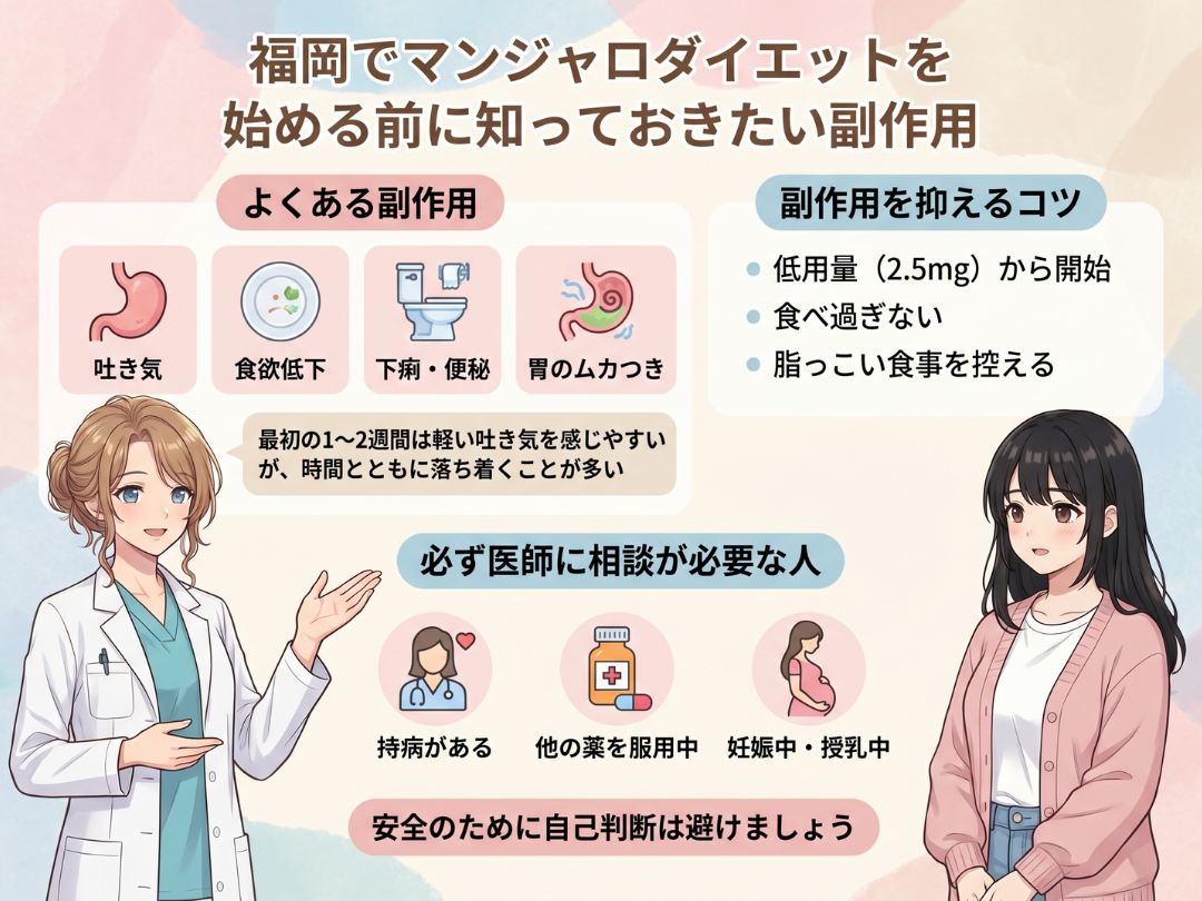 マンジャロは効果が高い分、副作用についても事前に知っておくことが大切です。知らずに始めると、不安になって途中でやめる原因になります。