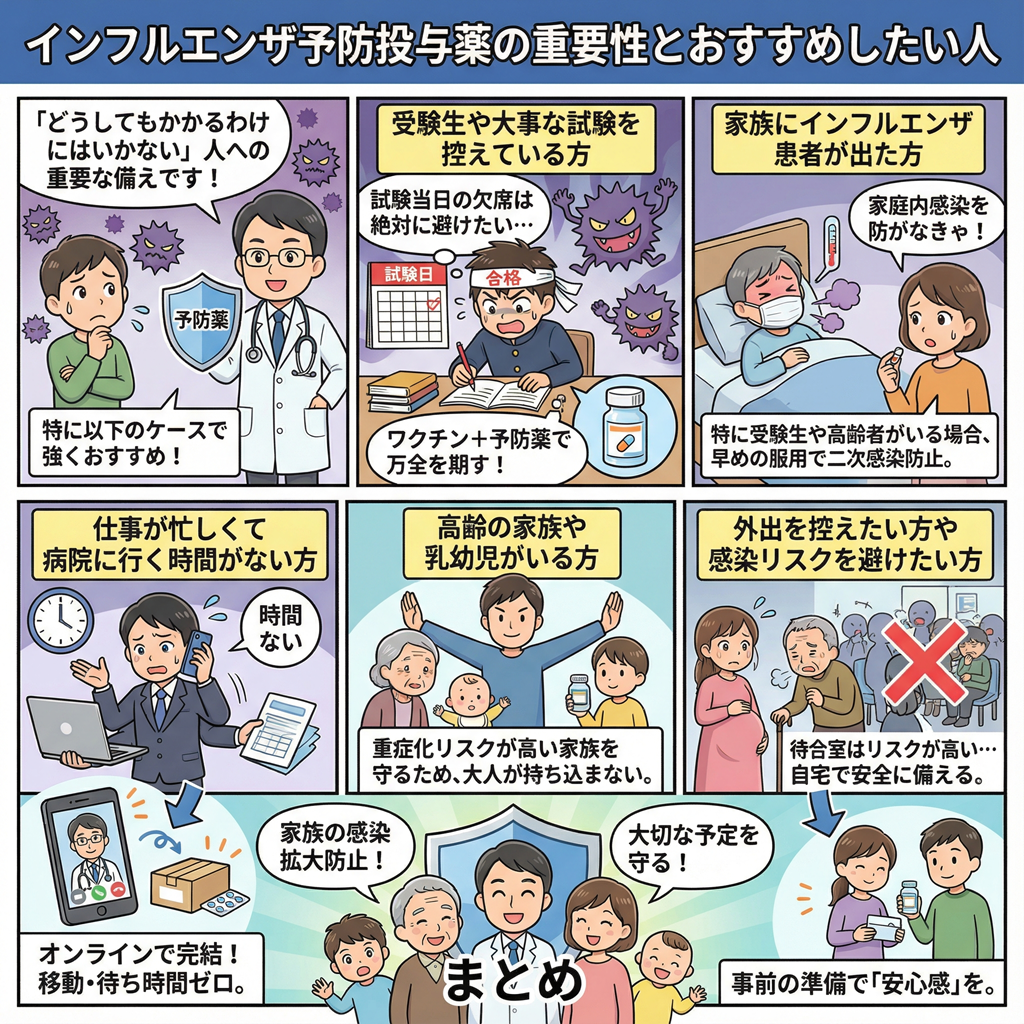 インフルエンザ予防薬は、「どうしてもインフルエンザにかかるわけにはいかない」という人にとって、非常に重要な備えになります。特に以下のようなケースでは、予防薬の活用を強くおすすめします。